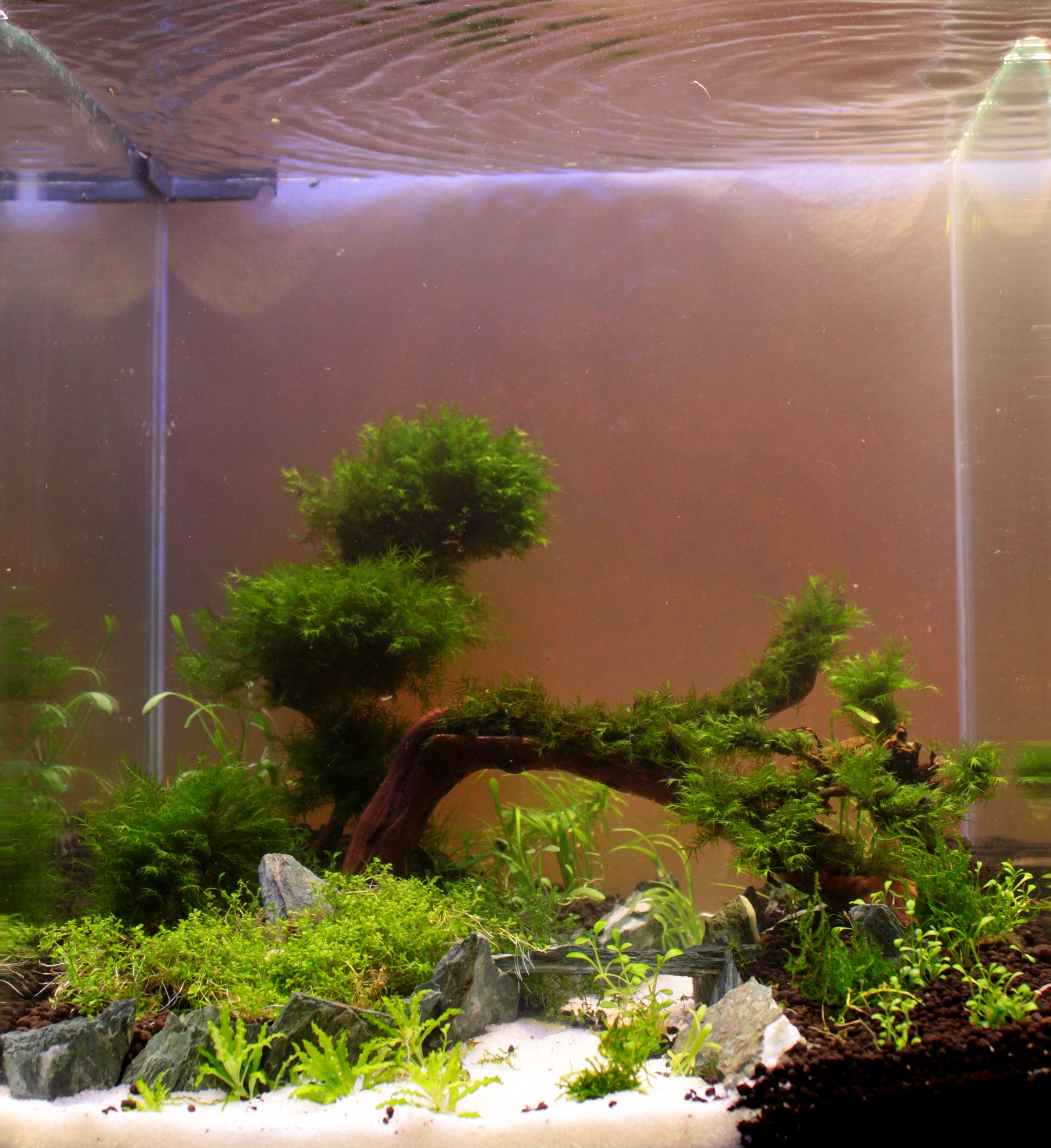Szürés egyedi 200l/ó 3dl mátrixtropp töltettel Világítás :egyedi led 400Lumen 6500K Nagynyomású co2 0-24 Talaj : tropica , kristálörlemény Dekor : szőlőtőke akác fák kristályos zöld márványdarabok Növények: Eleocharis acicularis fissidens fontanus Hemianthus callitrichoides Taxiphyllum sp. 'Flame Pogostemon helferi lilaeopsis mauritánia Glossostigma elatinoide Hemianthus micranthemoides Élőlények :neocaridina davidi