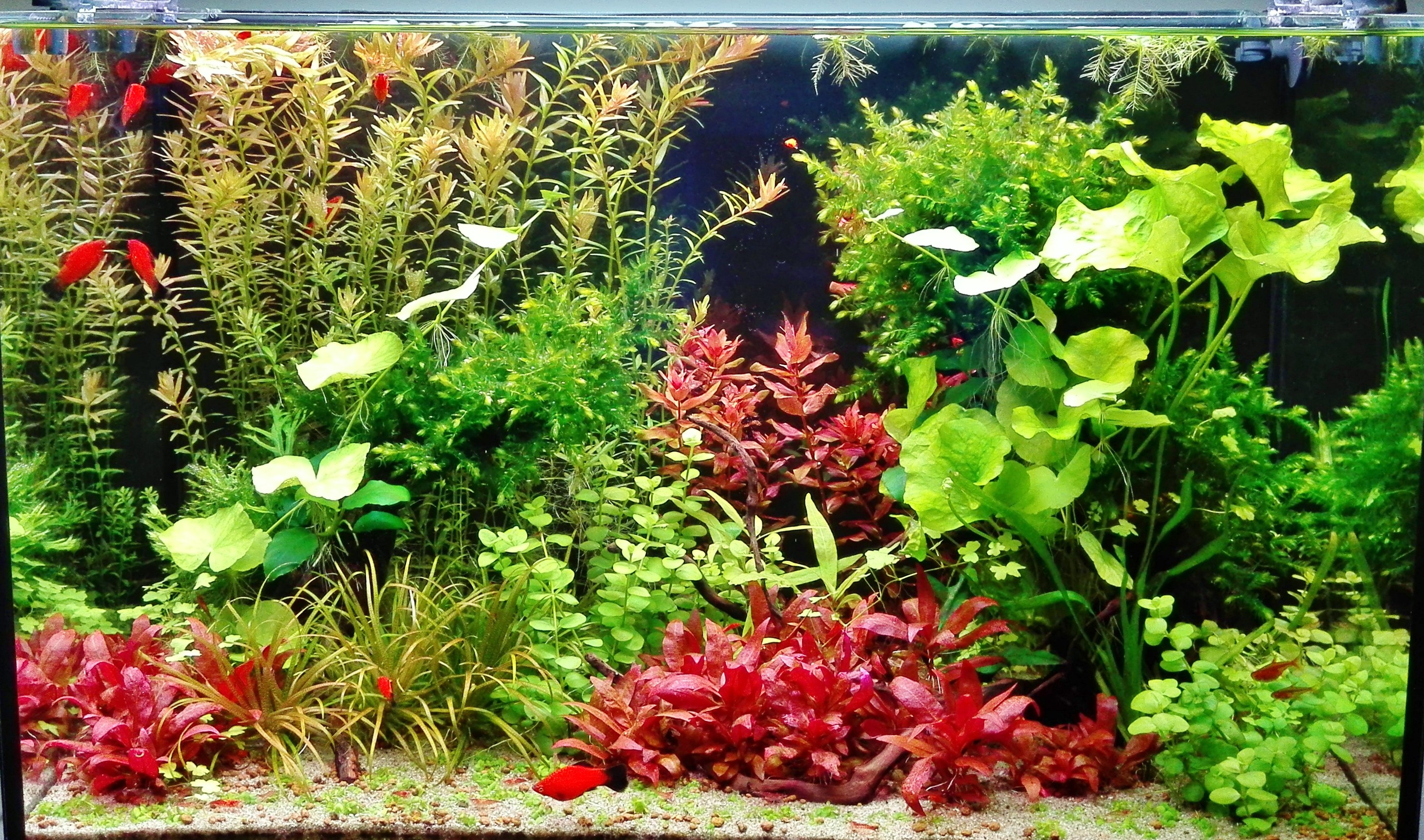 Szűrés:Eheim 2224 gyári töltet Világítás:Flexi-M 2x24 watt 1 daylight és 1 plant cső,napi 8h-ban Co2:nagynyomású,diffúzorral beoldva Talaj:0.4-1mm kvarchomok Tápozás:Tf planter,Tf macro és vas Növények: Rotala rotundifolia Rotala macranda Pogostemon helferi Reineckii mini Blyxa Cryptocoryne parva és wendtii Monosolenium tenerum Willow moha Anubias nana Bacopa australis Hydrocotyle tripartita Hydrocotyle leucocephala Nymphaea sp taiwan Élőlények: Platti kb 20db Amanda lazac 1 pár Ancistrus 1db Red cherry garnéla kb 100+db