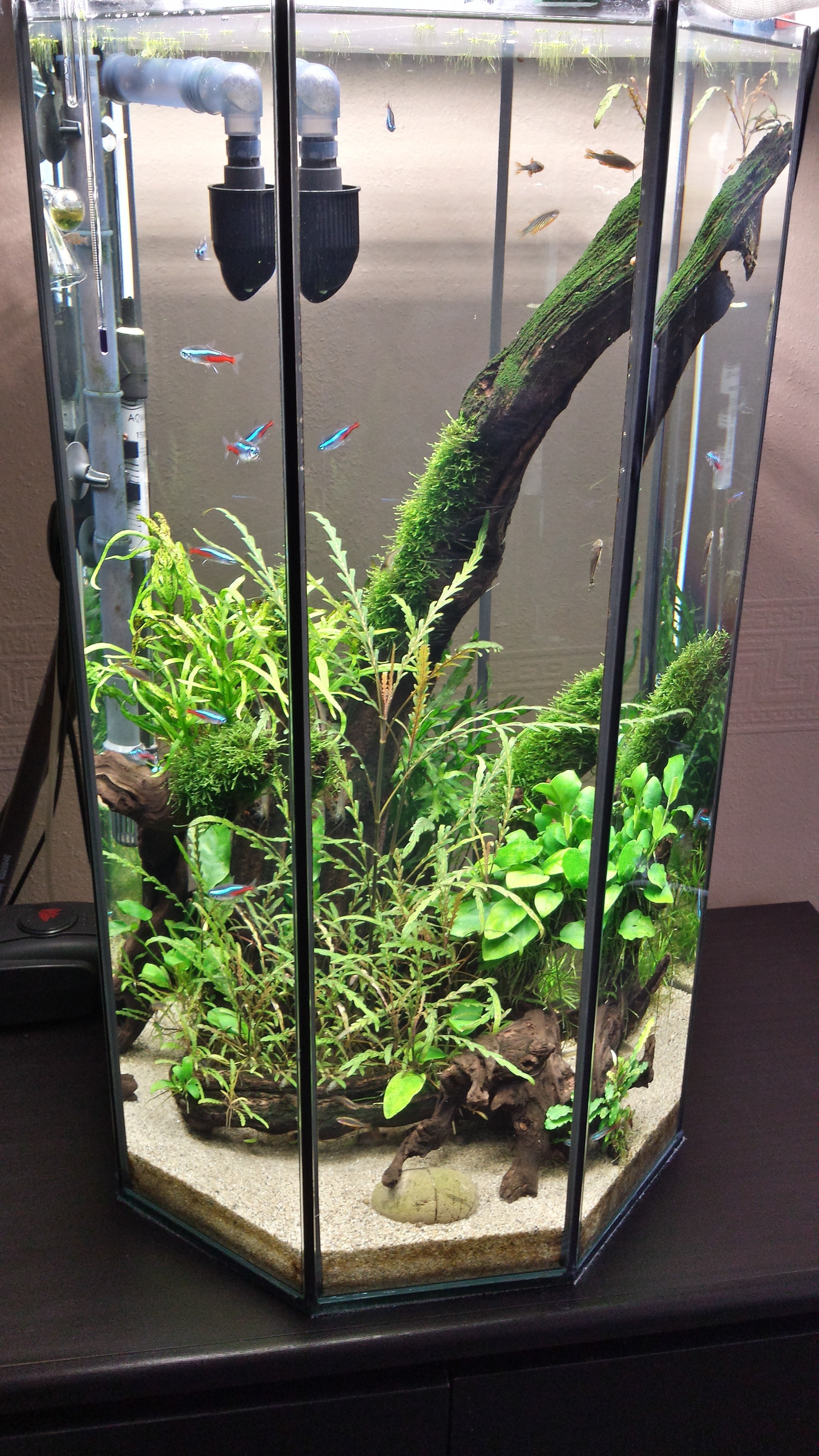75 cm magas, átlagos átmérője 42cm. Űrtartalma kb. nettó 75 liter. Alakja szabályos nyolcszög -Szűrés: Eheim 2075; -Világítás: Ledes, 2500lumen; -Talaj: Marosi homok-táptablettával -Táp: TF macro-micro; -Nagynyomású CO2. Növények: Anubias Nana, Hygrophila Pinnatifida, Bucephalandra Wavy Leaf, Vesicularia Dubyana, Microsorium Pteropus Trident, Bolbitis Heudelotii Halak-rákok: Paracheirodon innesi, Danio margaritatus, Corydoras panda, Otocinclus, Crossocheilus siamensis, Xiphophorus maculatus, Caridina multidentata