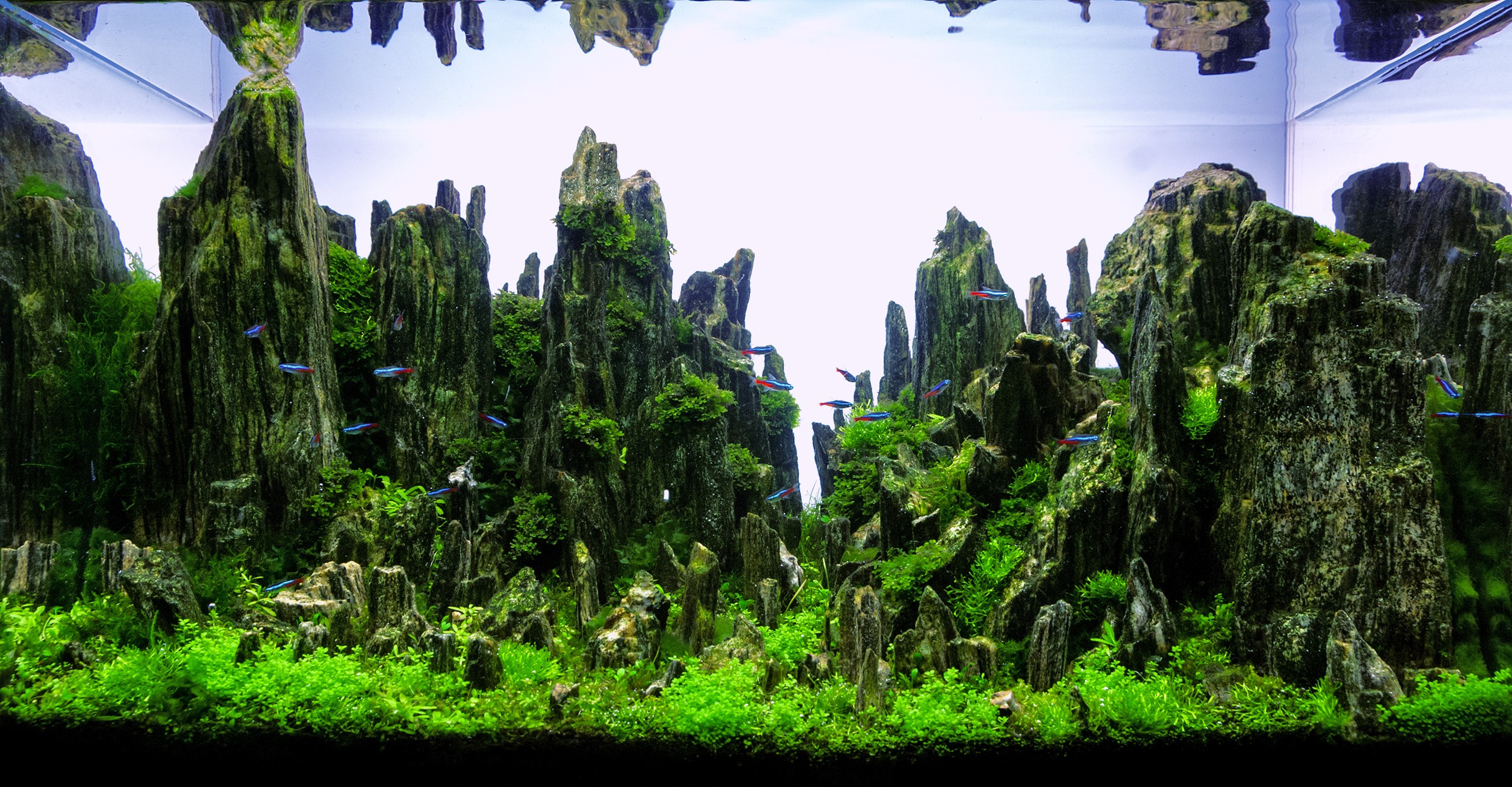 Huangshan-Tiandu-fen Akvárium mérete : 60 x 30 x 32 60 liter Világítás : T5 6500 k 2 x 24 watt Szűrés: Tetra Ex-800 plus 800 liter/óra CO2 tápozás: magasnyomású 2 kg palack diffuzorral beoldva Vízcsere gyakorisága: heti 30 % Tápozás: Micro napi 1 ml Macro napi 1 ml Foszfát, porból keverve napi 2 ml Növények: Micranthemum Sp. Monte Carlo Marsilea hirsuta Eleocharis parvula Hemmianthus callitrichoides Riccardia chamedryfolia Fissidens Fontanus Vesicularia Montagnei Taxiphyllum sp. 'Flame' Riccia fluitans Aegagropila linnaei Halak, garnélák: Paracheirodon innesi Otocinclus affinis