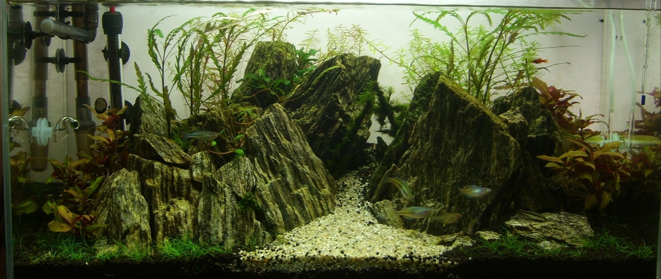 96l ( 80x40x30) , Világítás 4x 24W, Szűrés Tetratec 800EX, Talaj ADA Amazonia, Növények: Hygrophilia Pinnatifida, Parvula mini, Fissidend fontanus, Alternathera Reineckii 'Mini' ,Rotala Coin 'Leaf' Élőlények: Rohamsisak csiga, Zebra csiga, Amano garnéla, Boesmani kalászhal, Sziámi ormányos márna, Citrom lazac, Koi Xifó, Showa Xifó, Black Molly