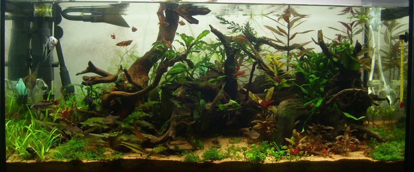 112l ( 80x40x35), Világítás 4x39W, Szűrés Atman CF800, EHEIM Skimmer 350l/h, Talaj DRAK kvarchomok, Növények: Alternathera Reineckii ' Mini', Ludwiga Glandulosa, Microsorium Pteropus 'Narow', Cryptocoryne 'Willisii' , Cryptocoryne wendtii, Sagittaria Subulata, Hemianthus Micranthemoides, Hemianthus Calithrichoides 'Cuba', Anubias barteri 'nana', Anubias 'Petite', Hirsuta Marsilea, Myriophillum matogrossense, Aponogeton Madagascariensis, Bolbitis Difformis Halak: Sziámi ormányos márna, Otocinclus Affinis, Titteya, Kakadú sügér, Vitroláshal, Fekete Fantom lazac,Corydoras Duplycareus