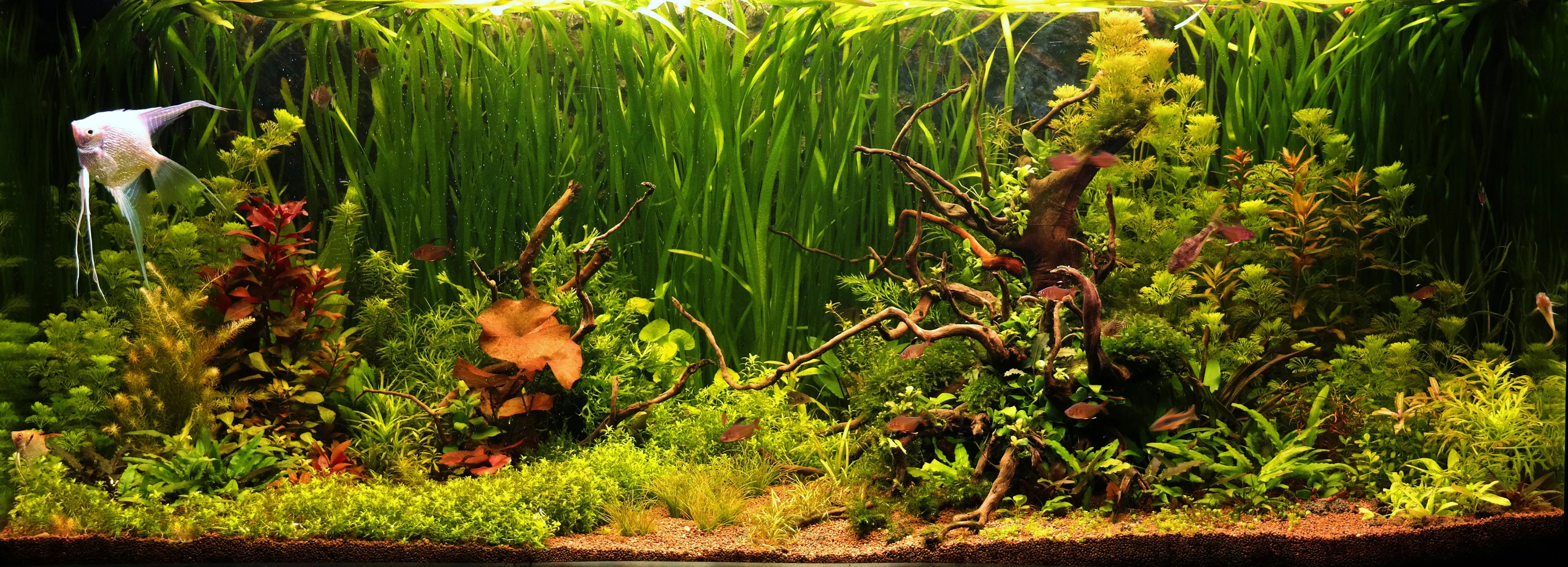 Akvárium mérete: 290 liter Technikai adatok Világítás: 4x54W T5 Odyssea, napi 8 órában Szűrés: Hydor Professional 600 Aljzat: JBL Manado Tápozás: Aqualine TF Makro- 9ml/nap, Aqualine TF Planter- 6ml/nap, TF „color"- 5 csepp/nap, Neptun Aquaplant- 4tbl/hó Vízcsere: Heti 30 liter csapvíz Növények: Vallisneria americana natans Lymnophila sessiliflora Prosperpinaca palustris „Cuba" Echinodorus bleheri Echinodorus Green hibrid Echinodorus tenellus Heternanthera zosterifolia Hygrophila polisperma „Rosanervig" Hygrophila difformis Hygrophila siamensis Eleocharis acicularis Sagittaria subulata Marsilea Hirsuta Penthorum sedoides Alternanthera Reineckii mini Hottonia palustris Hydrocotyle tripartita Didiplis diandra Ludwigia repens Ludwigia acuata Microsorum pteropus „windelov" Nymphaea lotus Blyxa japonica Rotala indica Rotala bonsai Nymphoides hydrophylla „Taiwan" Hemianthus callitrichoides „Cuba" Hemianthus micranthemoides Lobelia cardinalis mini Staurogyne repens Bacopa caroliniana Anubias nana „Petite" Bucephalandra sp. „Red" Bucephalandra „Wavy Green" Ceratopteris thalictroides Cryptocoryne wendtii green Cryptocoryne wendtii „Mioya" Cryptocoryne flamingo Cryotocoryne aponogetifolia Fontinalis antipyretica Monosolenium tenerum Halak Pterophyllum scalare (Vitorláshal) 2 db Hyphessobrycon rosaceus (Rózsalazac) 12 db Gymnocorymbus ternetzi (Fekete tetra) 8 db Corydoras aeneus (Kékpajzsos páncélosharcsa)5 db Corydoras sterbai (Narancsúszójú páncélosharcsa)5 db