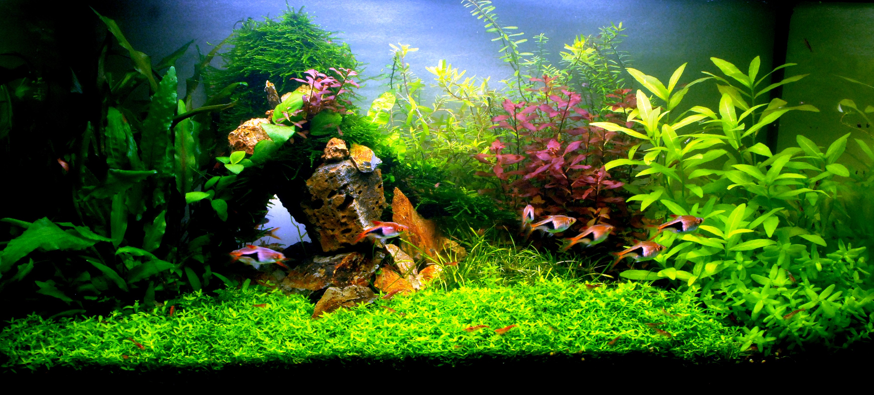 Akvárium indítása: 2016. 03. 01. Fény: 3x15w T8 Szűrés: Eheim Biopower 160 Tápozás: TF tápok Talaj: Dennerle Scaper's Soil Növények: Anubias barteri, Bacopa caroliniana, Cryptocoryne wendtii green, Cryptocoryne beckettii, Echinodorus tenellus, Hemianthus glomeratus, Hygrophila polysperma, Ludwigia palustris, Rotala rotundifolia, Taxiphyllum barbieri Halak/garnélák: Trigonostigma heteromorpha, Neocaridina davidii