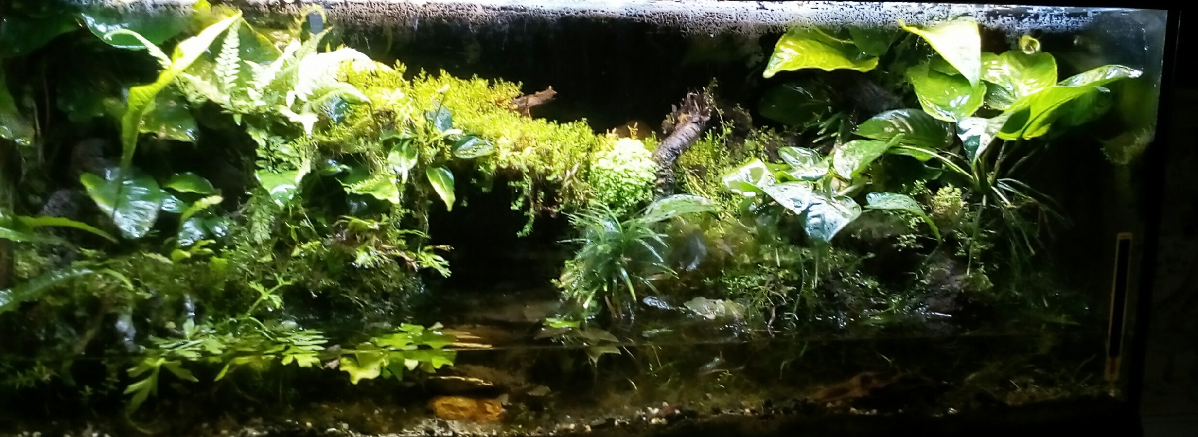 z akváriumot 1 éve építettük saját gyűjtött anyagokal ( kövek, fák) geosesarma fajok tartására. Kb 10 cm magas víz van benne (40 l) mert a geosesarma inkább szárazföldön tartózkodik. A szigeteken virágföldbre ültetés után kűlönböző méretű zúzott követ szórtunk. A vízben egyébként csak egy kis belsőszűrő dolgozik, és egy levegősztető és egy vízmelegítőt is elrejtettünk a sziget mögött. Minden etetésnél sricolóval nedvesítjük a leveleket. Havonta kétszer 10-15 csepp növénytápot adagol a fiam a vízhez. Megvilágítás 120 led/m hidegfehér elől és hátul, de a hátsót csak néha kapcsoljuk fel. Középen 60led/m melegfehér megvilágítás az első hidegfehérrel reggeltől estig üzemel. A vízben garnélák, és néhány guppi is van, de lehetséges, hogy későbbiekben guppik helyett betták lesznek tartva.