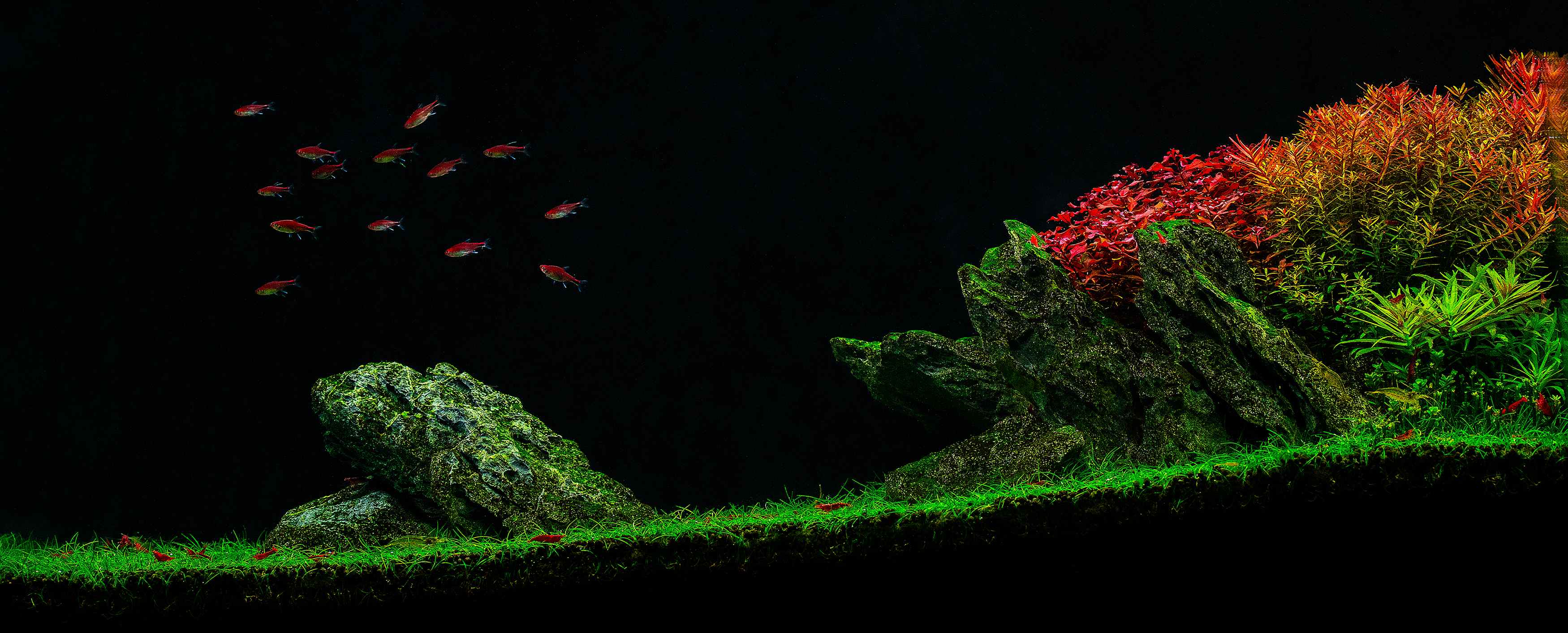 Az akvárium kialakításánál az volt a fő szempontom, hogy egy olyan akváriumot hozzak létre, ami 2 oldalról látható, mivel egy pulton van és a nappaliból és a konyhából is lehet látni. A kicsi méretei miatt nehéz volt, ed úgy érzem sikerült elérni a kívánt hatást.