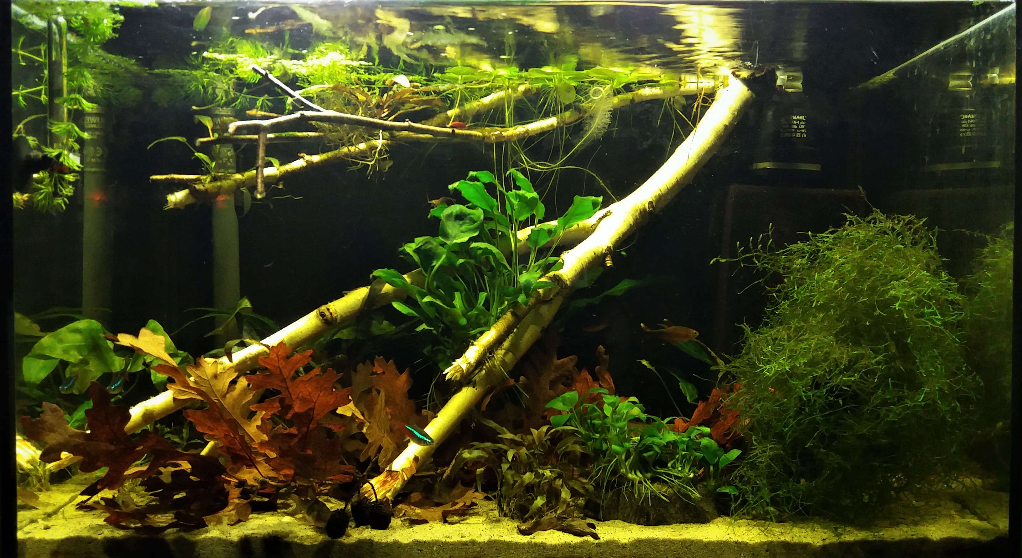 60x35x40cm (84 liter), Aquael szűrő 10x10x20cm szivacskockával tuningolva. TF tápozás, 2x10w led reflektor világítás napi kb 8 órában. Lakói neonok, rézlazacok, 4db Corydoras, rengeteg neocaridina davidi garnéla és helena csiga. Növényzet kb 6 féle Cryptocoryne-ból, 2 féle Anubiasból, 3 féle Bucephalandrából, mohából, tócsagazból békalencséből és békatutajból áll. Dekorációképp egy nyírfaág került bele, egy tölgyfaág levelestől, valamint néhány égertoboz és kavicsok. Talaj kvarchomok, a Crypto-k tövéhez szoktam lenyomni Aquaplant táptablettát."