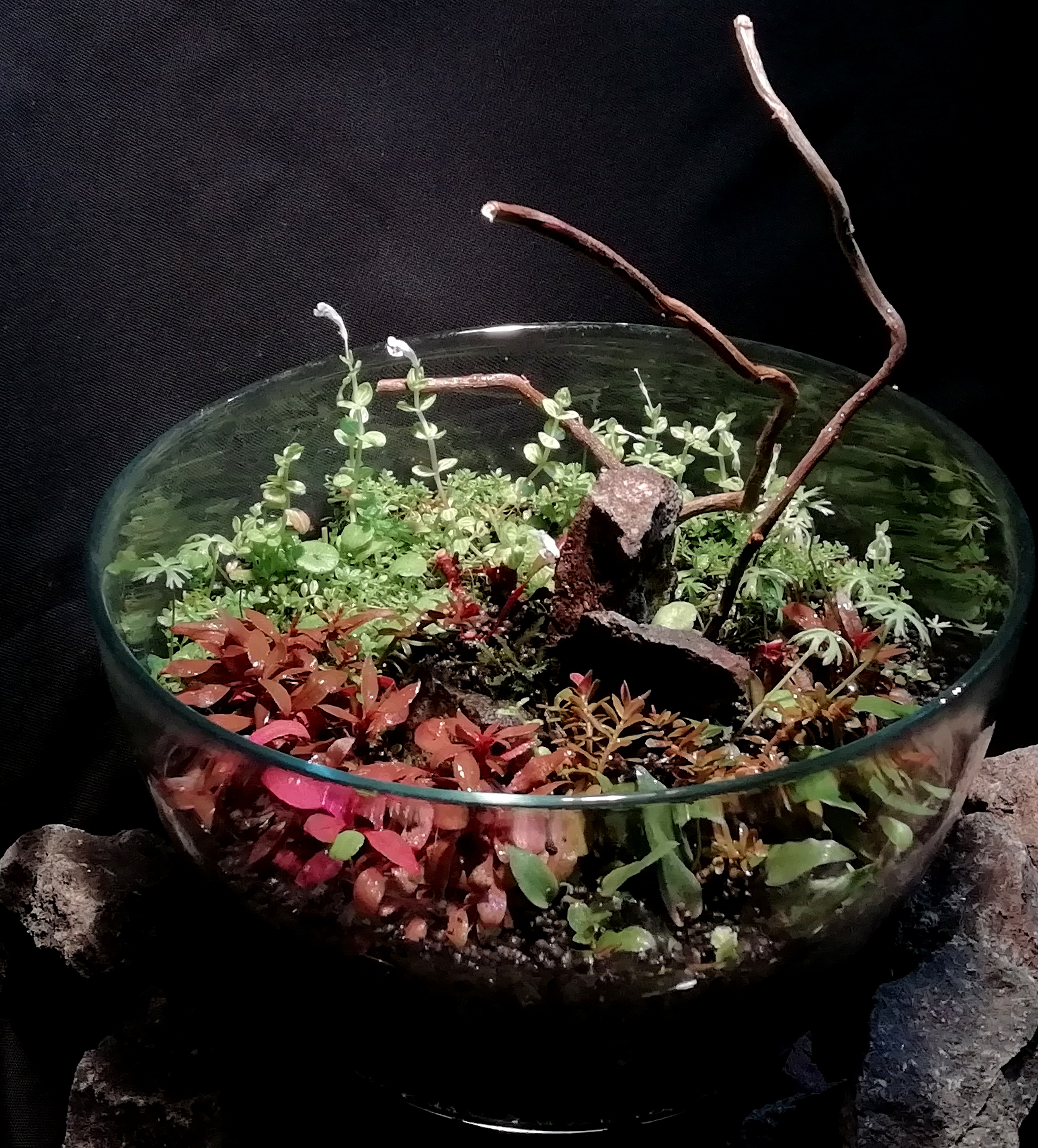 20 cm átmérő, ültetőközeg: aktív aljzat, tápozás akváriumvízzel, világítás 5W 6500K ledizzó+természetes fény napi 15 órában.