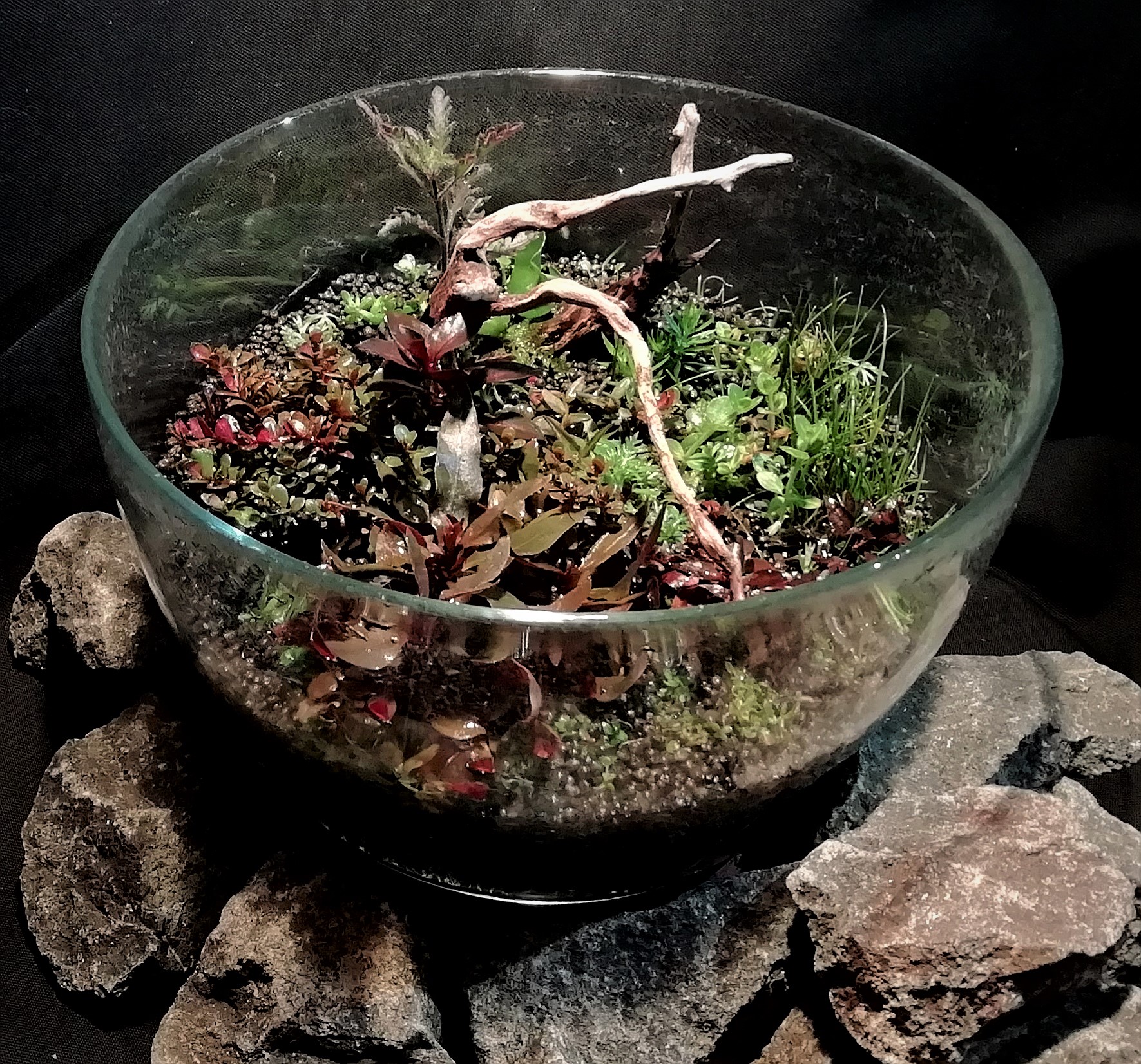 20 cm átmérőjű tál, aktív aljzatos ültetőközeg, akváriumvízzel tápozva, 3 W 6500K ledizzóval világítva napi 10 órán át.