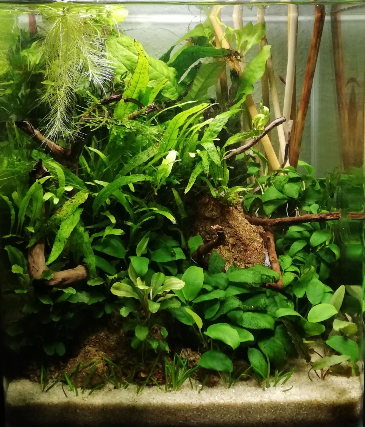 25x25x30:18l világítás haqoos led lámpa tf tápok szűrés aqvacorner 60 sarok szűrő. Talaj szűrő homok dekoráció vörös lávakő és red mór gyökerek, nád. Növények :Jávai moha, Microsorium pteropus, Bolbitis heudelotii, Bucephalandra wavy Green, Microsorium trident, Litorela uniflora. Anubias nana. Criptocorine brown, Limnobium levigatum. Lakók garnélák csigák.
