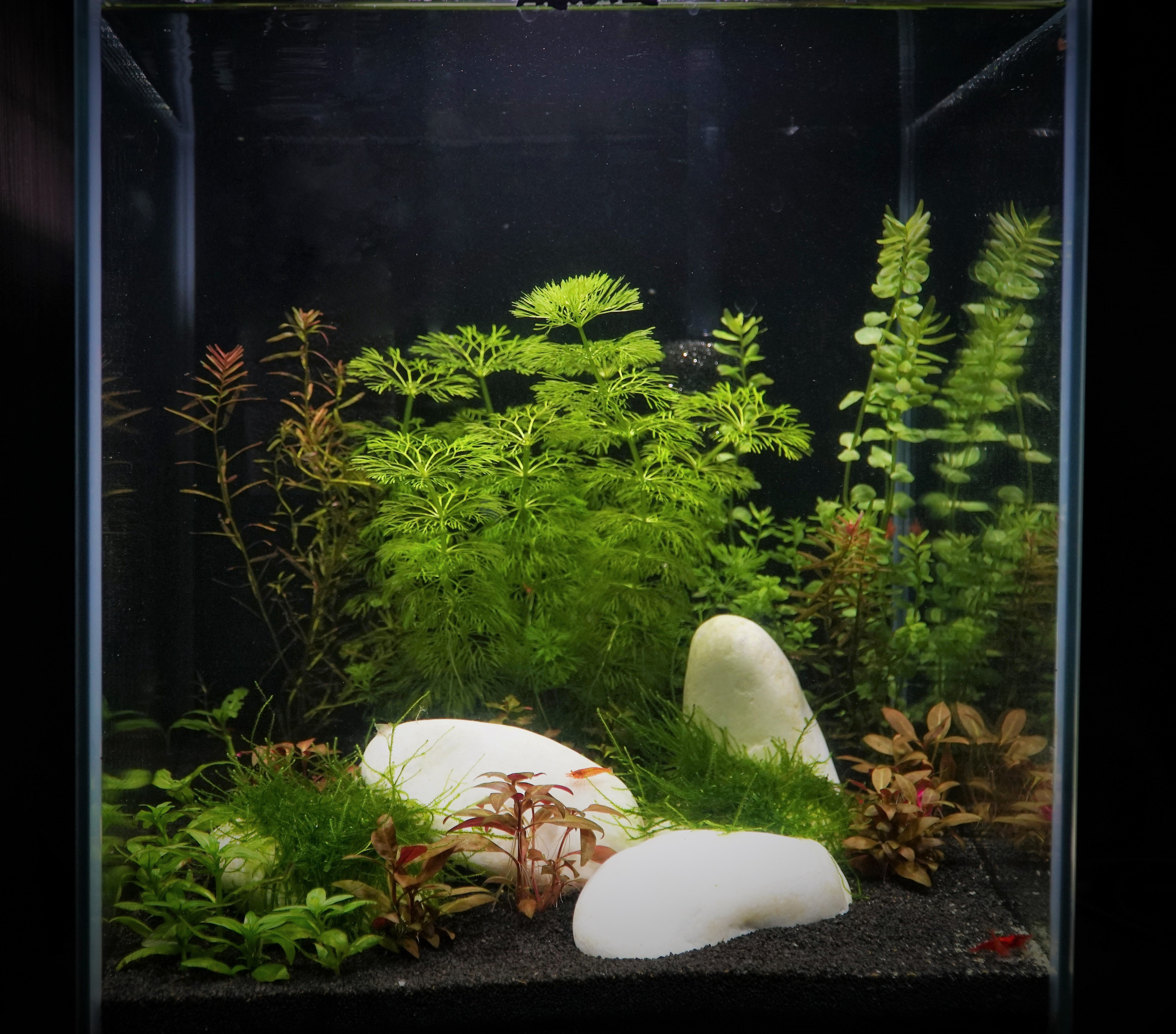 Akvárium: 30 liter Szűrés: Aquael PAT mini, ISTA-f200 Világítás: Aquael leddy smart 2 plant Talaj: Dennerle fekete garnéla talaj, alatta JBL aquabasis táptalaj Lakók: Red sakura és Bloody Mary garnélák