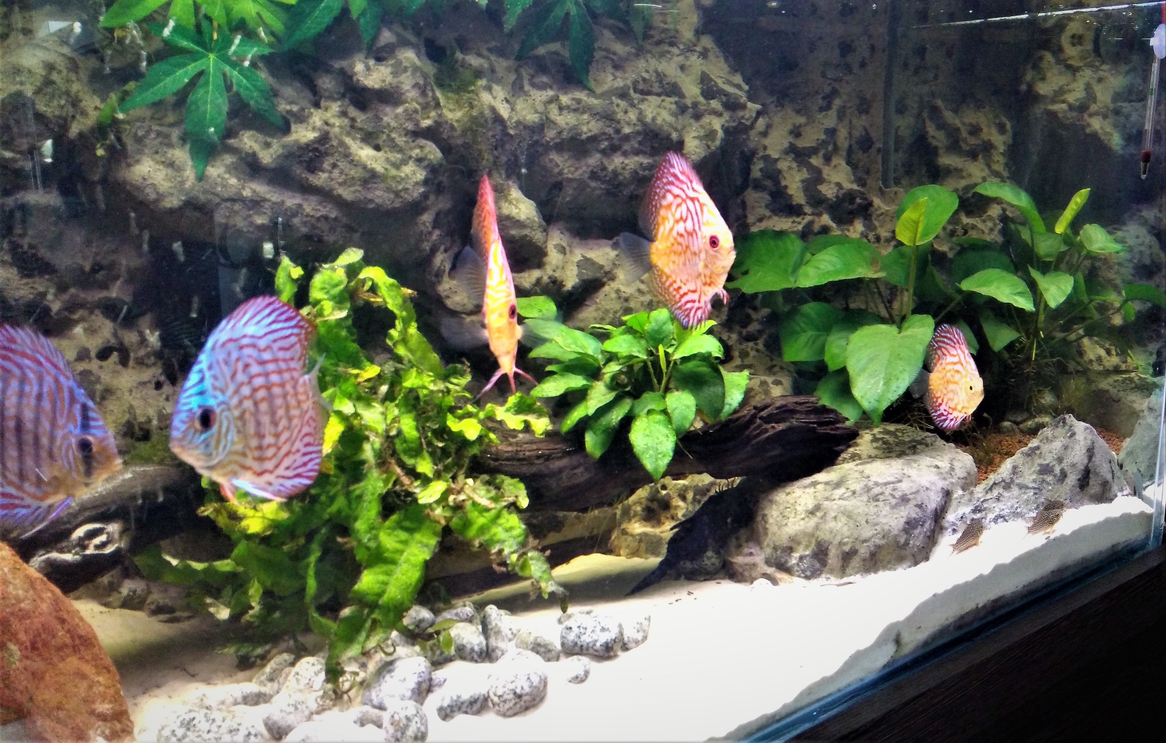 Az akvárium 150x60x60. Régóta szerettem volna megvalósítani. Eredetileg afrikai sügéres lett volna, de egy Tropicarium-ban tett látogatást után, családi nyomás hatására lett diszkoszhal! 6 db diszkosz, 4 db Corydoras sterbai, Anci-k, algázó gébek.