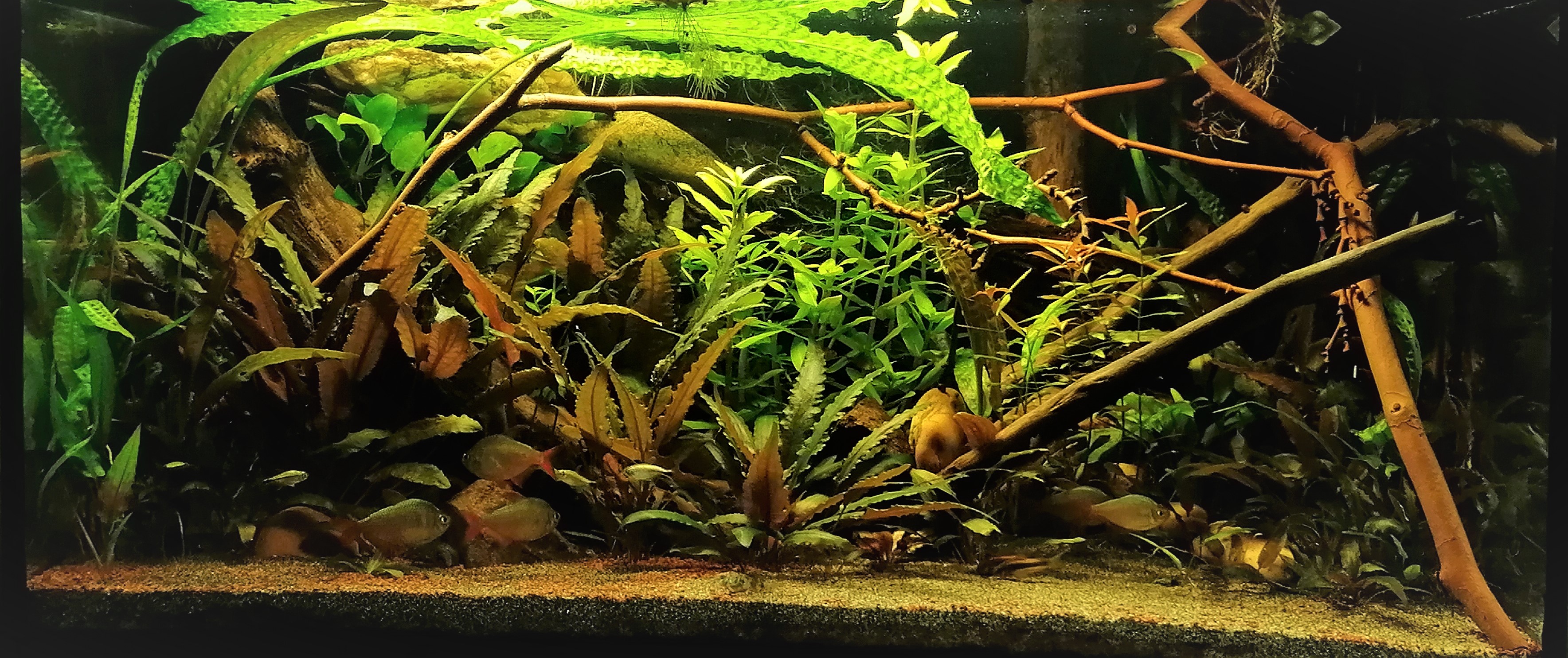 Lakók: Hyphessobrycon columbianus, Hemigrammus rodwayi, Hyphessobrycon amandae, Corydoras (habrosus, pygmaeus, paleatus, orange laser, bronze, panda) , Otocinclus
