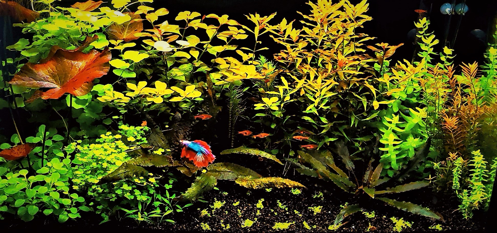125 liter 25l..tetra ex1200 szűri,led lampa világit felette 9200lumen. sima talaj, fekete kvarckavics 0,2mm. júniusban indult.