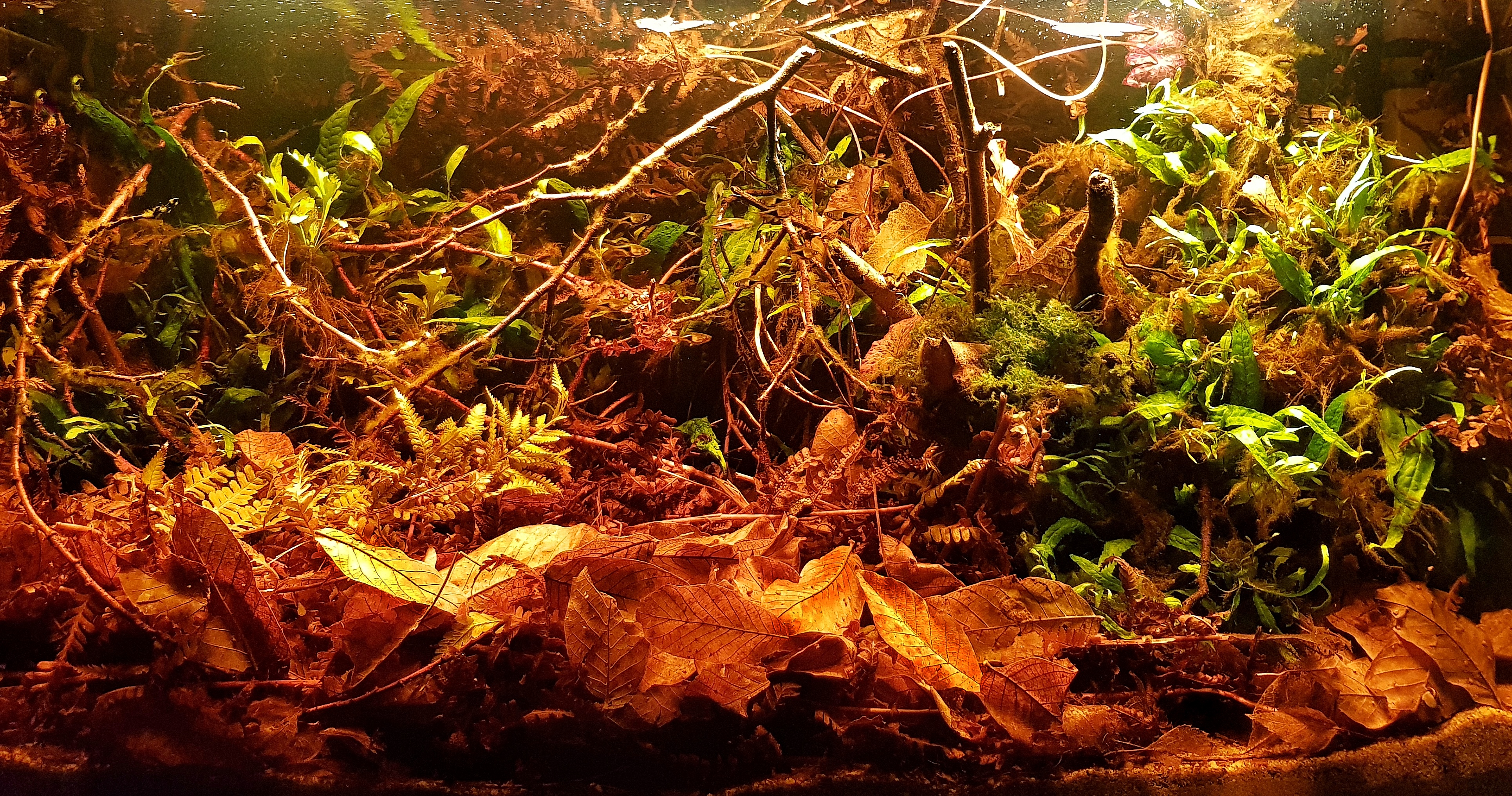 Kedves Olvasó mindig is közel állt hozzám a részletgazdag(ami egy foton hátrány is), rengeteg apró részlettel teli akvarium ámde nem a ma ismert es kedvelt akvakertész formába. Én inkàbb a természetközeli kialakítást kedvelem és a a sötét vizet a Blackwater-t. Ehez sok mindent hozzá tartozik. Most húzunk búvarszemüveget és nagyképernyőn merüljünk egy Ázsiai vízfelszin alá egy kieső partszél egy csendes folyóba kiöblösödő szakaszt. Ami mindenképp hozzá tartozik az alga. Van is, nem küzdök ellene inkább egy kompromisszumos: "Ha már van több és kevesebb ne legyen". A víz semmi más mint általam gyűjtött esővíz. Gh 2-3 kh 0-1. Ph folyamatosan változik a 6-6.8 között. A puffert a talaj adja kb 25kg szűrőhomok 0.7-0.9mm átmerőbe. Bár a talajt nem látja az ember hatékony szűrése elegedhetetlen. A talajemelebe lávakövel és bazalt adja. Dehát ez sem látható a képen de funkcióját betölti. Fákat is magam szedem. Egy jó nagy szilvagyökér es szilvafa gallyak láthatóak benne . Világítas 3x50 w 3000kelvin színhőmérsékletű ledreflektor. 7-19ig világít. Hosszúnak tűnik de a víz sok mindent elnyel. Most is van olyan sötet hely mint a vakond zsebe. A viz sötétitesét égertobozzal oldom meg. A leveleket magam szedem. A képek dió,nyír és erdei pajzsika levelei áznak a vízbe. A vizbe microsorium pteropus és narrow típusa làtható. Némi Taxyphyllium barbirei és Ceratopteris thalictroides is làtható. A Nymphea zenkerii red lotus meg csak most bontogatja leveleit. Megsinylette a nehéz indulást. De jó ismerösöm tudom mire lesz képes. Állatvilág amiről tudok Trigonostigma heteromorpha amit az ügyes szeműek észre is vehetnek. Trichopsis vittatus 2 db nőstèny és jó pár Helena csiga. Sajna a karantenidőszak nem tette lehetővè a nagyobb fajgazdagsàgot. A vizet most naponta 1 pumpa Tf maco ès 1 pumpa tf planter mellett 3 ml Carbot is kap. Citromsavas Co2 is kap 4-5mp/1bubi. A vizet egy régi tipusú atman 3338 és egy sera fil bioactiv 250 latja el patyolat tisztára.