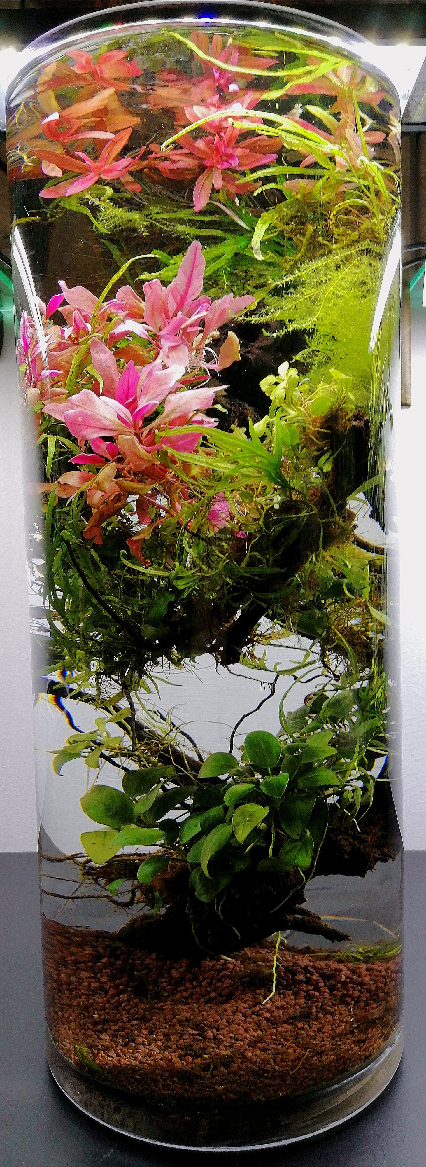 Egy 55 cm magas , 20 cm szèles hengerben megàlmodott, spiràlis elrendezèsü hardscape-n anubiasok, forràsmoha, microsorum trident, ammannia praetermissa, alternanthea reineckii kapott helyet. Versamax FCNmini akasztòsszürő, alkalom adtàn egy pici Tropica Specialised Nutrition , csak akvàriumvizzel van visszatöltve ès hòlyagcsigàk lakjàk ;)