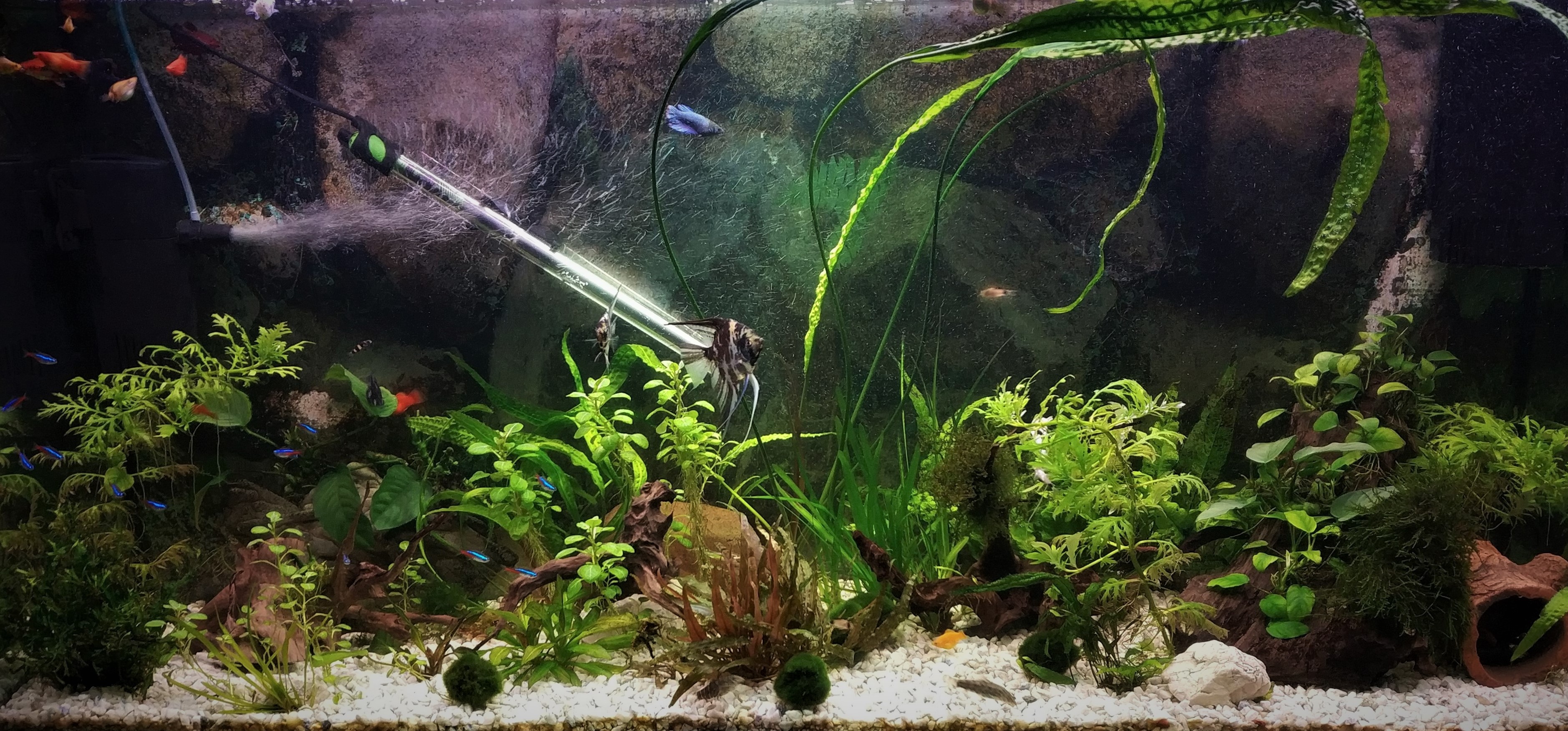 Lakók: Platti, gömb molly, darázs géb, neon, vitorláshal, szifó, betta nőstény, panda harcsa, páncélos harcsa, zebra öves díszcsik, ancistrus.