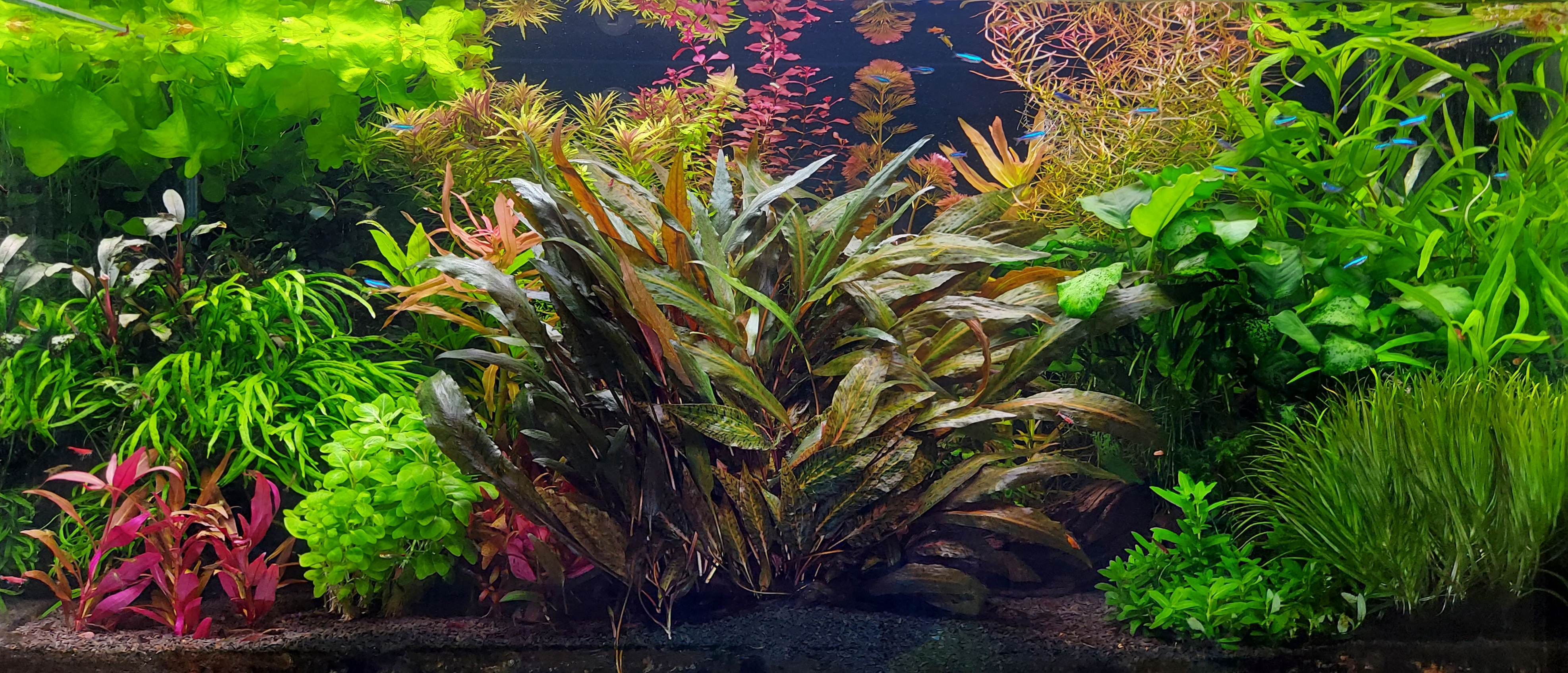 00 liter(100*40*50) Fény:Odyssea quad 4*39w(2 db Sylvania 6500k-s fénycső, Odyssea Plant cső+Sylvania Grolux fénycső) Szűrés: Hydor 600 Professional Aljzat: Garri tóföld Manado Black-el fedve