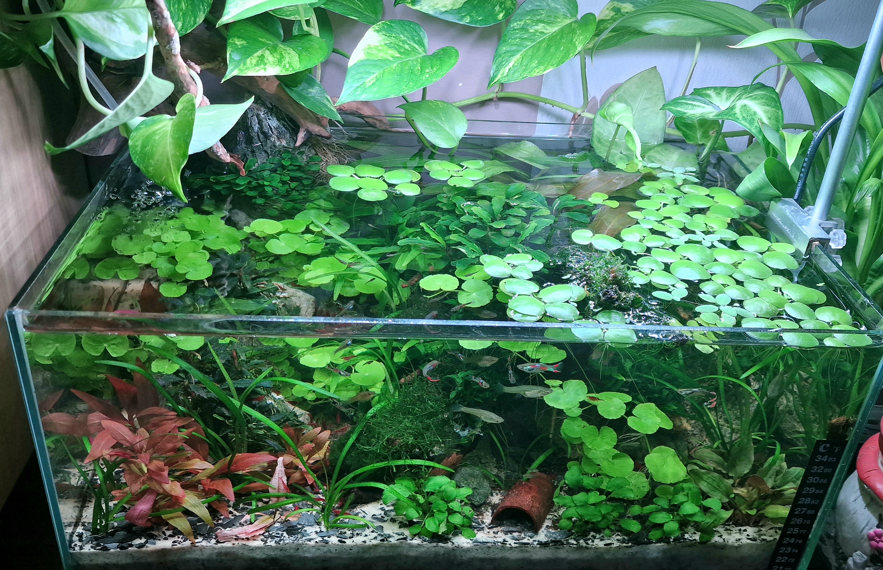 Az akvárium lakói: Red Sakura és Bloody Mary garnélák, Endler Guppyk, 3 db törpe cory és 2 db törpe szívóharcsa.
