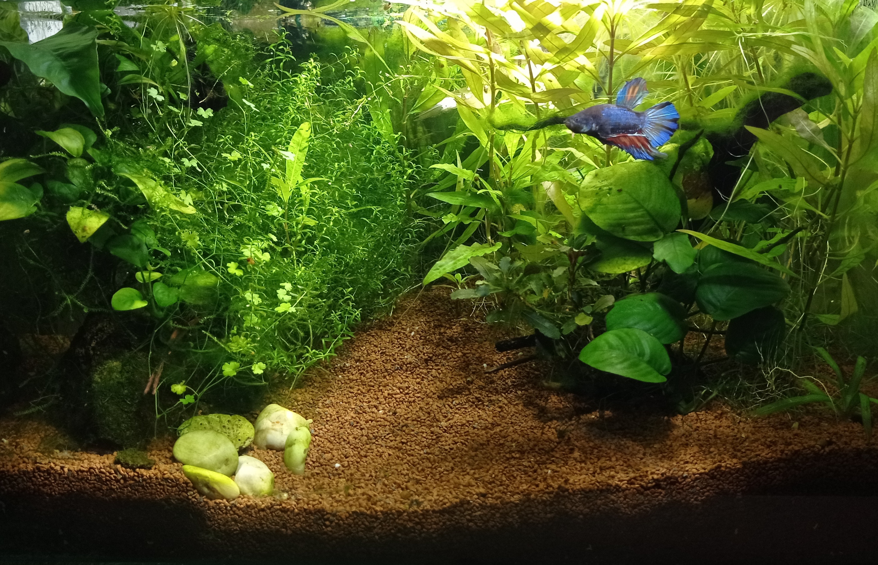 40 literes bettás-garnélás Neve: Mini dzsungel Low tech, nincs co2, teljesen alap akvárium, "no neme" nano lámpával, belső szűrővel. Fél éve az előző leeresztett (szétment), cserélni kellett, így fél éves az üveg. Gondmentes.
