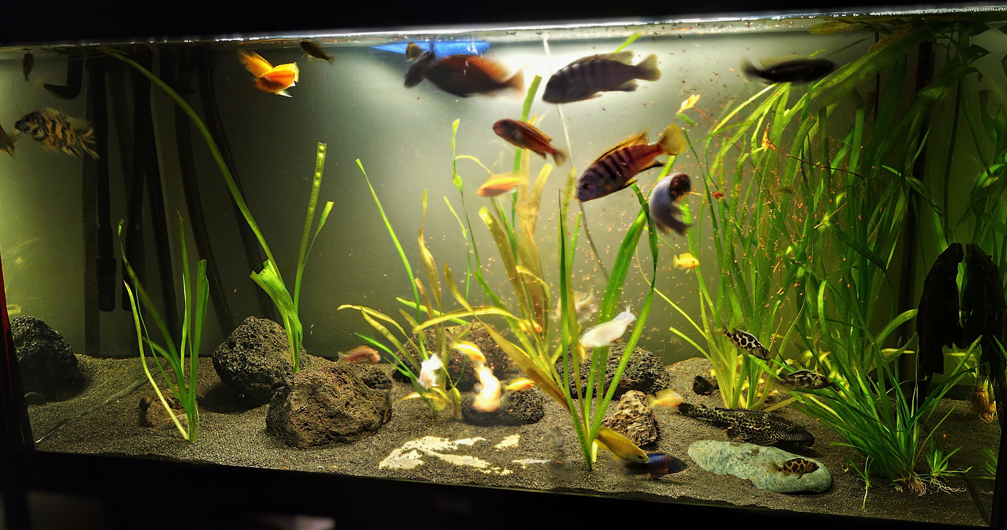 Igaz nem vagyok a legjobb és a legöregebb a dologban ,de imádom és ez a lényeg . Juwel Rio 350 az akvárium pontos neve ,mérete 121x51x66 cm. A halak többsége párban vagy csoportban van . Személyes kedvencem a Csíkos tűzsügér (Haplochromis sp. 44) és a pávasügér (Nimbochromis venustus).azért nevezek ,hogy kapjak egy kis vissza jelzést ,hogy jó-e amit csinálok vagy csináljam máshogy. 14éves vagyok és komolyabban érdekel a dolog ezért kérek visszajelzést. Már Pseudotropheus crabro, Maylandia estherae és Aulonocara sp. OB ifjoncok születtek nálam.