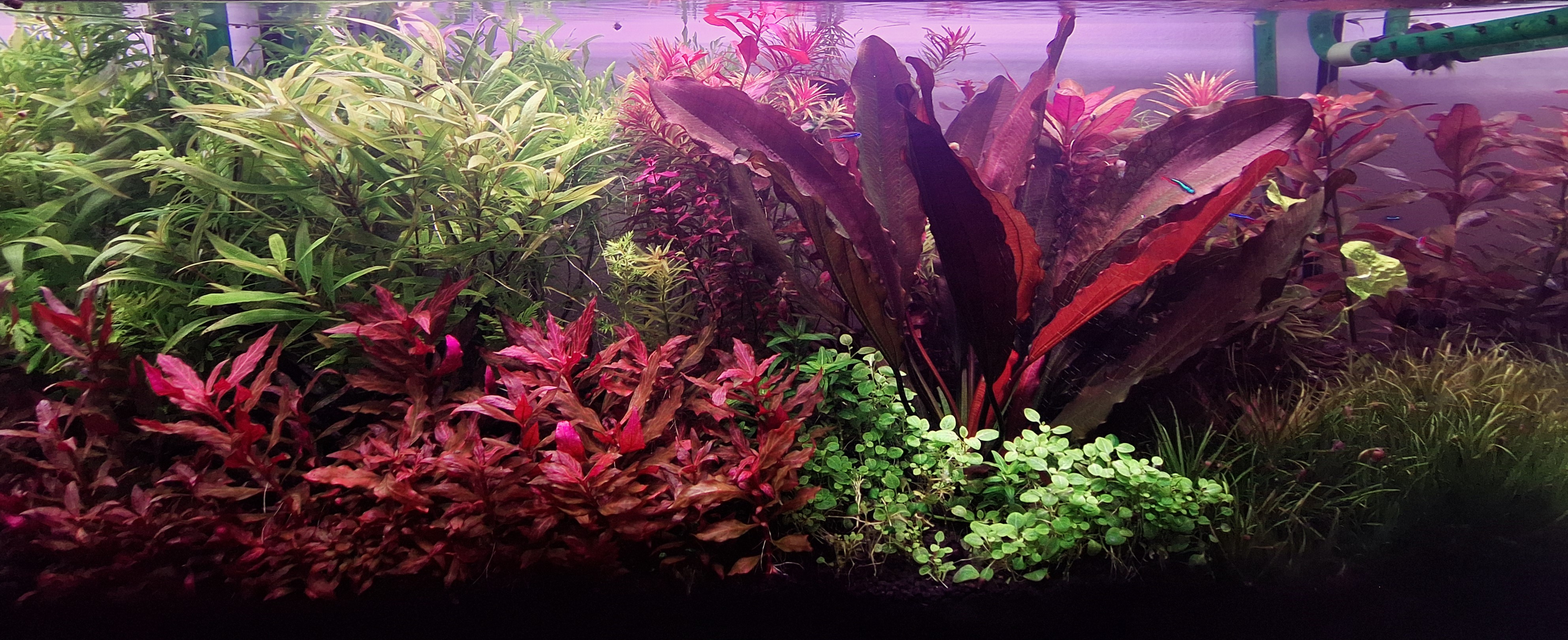 LOW TECH kategória.Vadas Halas az akvárium neve,a következő méretekkel.100x40x45,vagyis 180 literes.Week Aqua pro 900 as lámpa adja a fényt napi 8 órába red módban,70 százalékon.Eheim 350 külső szűrő tisztítja a vizet.RO vizet használok kb 8ra van vissza sózva a keménysége.A lakói:11 kék neonhal,8 galaxy razbóra,3 csoki csík,3 sisakcsiga,pár toronycsiga,2 darab törpe szívóharcsa. A növények:lobélia cardinalis mini,echinodorus,cryptocoryne,alternanthera reineckii. A tápozás:napi 4 pumpa macro,2 pumpa mikro és 3 pumpa carbo.Havonta pedig 3-4 tf talaj kapszula.