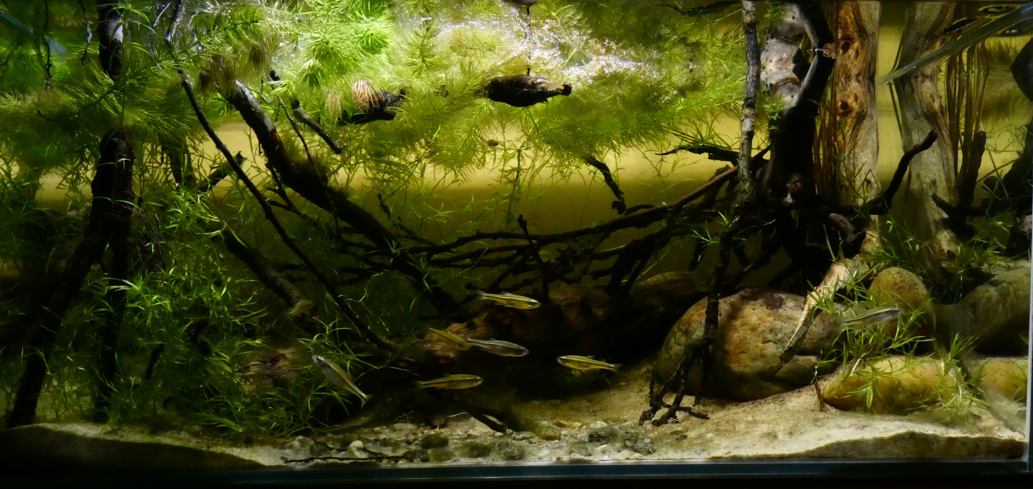 Ebben a kis akváriumban igyekeztem egy teljesen természetazonos élőhelyet kialakítani egy igen veszélyeztetett faj számára, ami nem más, mint a Notropis amecae (angol neve :Ameca shiner) Hazájában,Mexicóban, a teljes kihalás fenyegeti (1996-ban kihaltnak nyílvánították, de egy kisebb, 40 egyedet számláló csapatot sikeresen visszatelepítettek 2017-ben). Szerencsére lelkes akvaristák és szakértők próbálnak minél nagyobb populációkat létrehozni, egy esetleges újbóli visszatelepítés reményében. Az erős vízmozgást nemigen kedveli. Aljazatnak finom homokot szórtam be, néhány szegletben aprószemű sóderral vegyítve. Dekorációnak gyökereket használtam. Növényeket tekintve az uralkodó poziciót a Najas guadalupensis tölti be, de a felszínen úszik jópár békalencse is. A jobb hátsó sarokban egy mocsári növény is helyet kapott. (Növények :Najas guadalupensis, Lemna minor, Ceratophyllum demersum, Juncus sp.) Ikrázó hal. Ha nem vagyunk elég figyelmesek, akkor ívás után hajlamos felfalni az ikrákat. Maximális testhossza 5cm körül mozog. Naponta többször, kis adagokban etetem őket. Leginkább fagyasztott fehér és vörös szúnyoglárva és frissen keltetett artémia van az étlapon.
