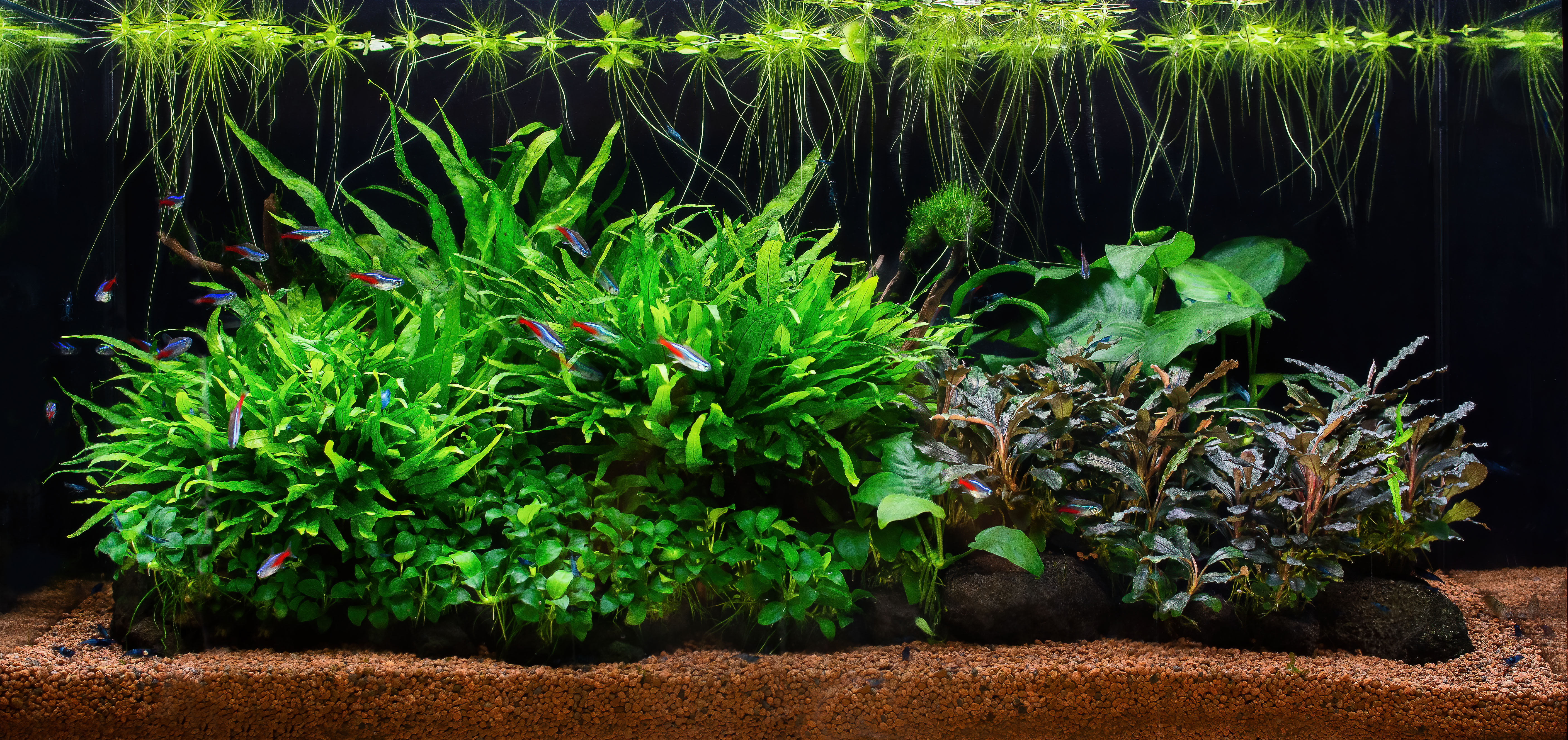 Az akváriumban fekete lávakőre és red moor fára rögzített növénypaletta, valamint némi felszíni úszónövény nyújtja a látványt.