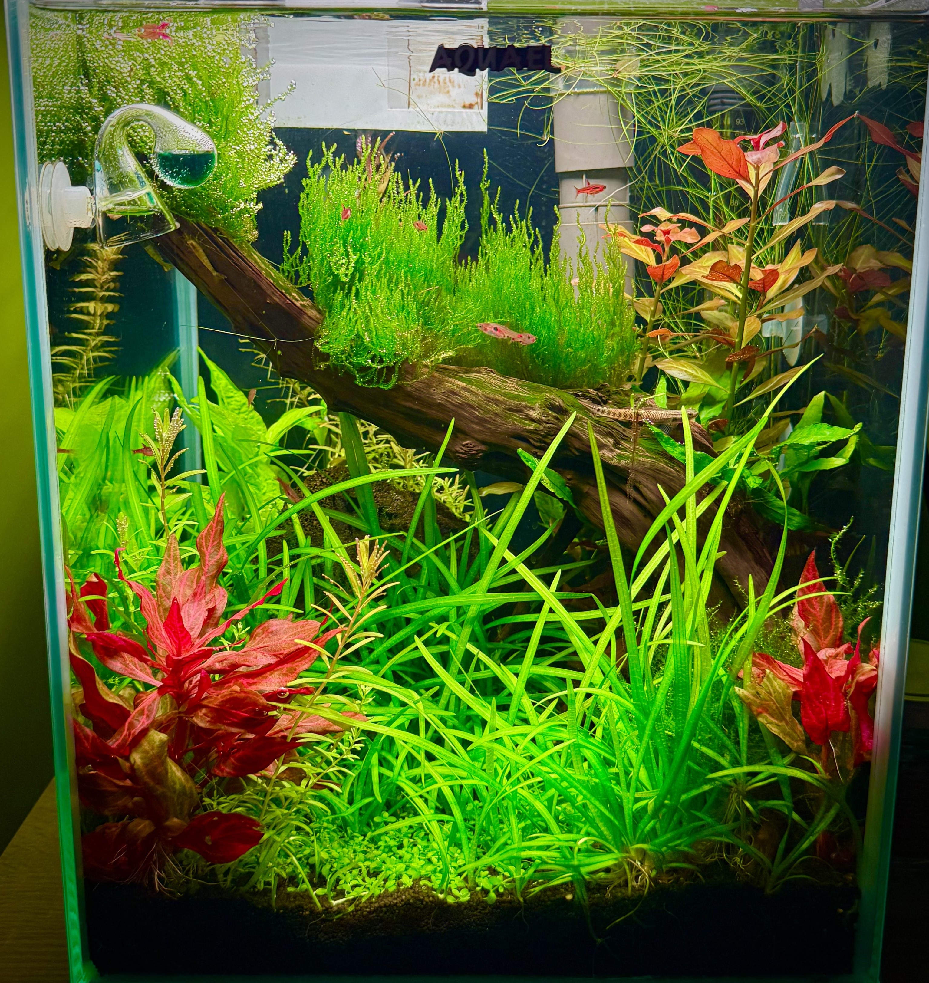 Élőlények: garnélák: neocardinia, cardinia, géb, corydoras pygmaeus, szívóharcsa és razbórák.