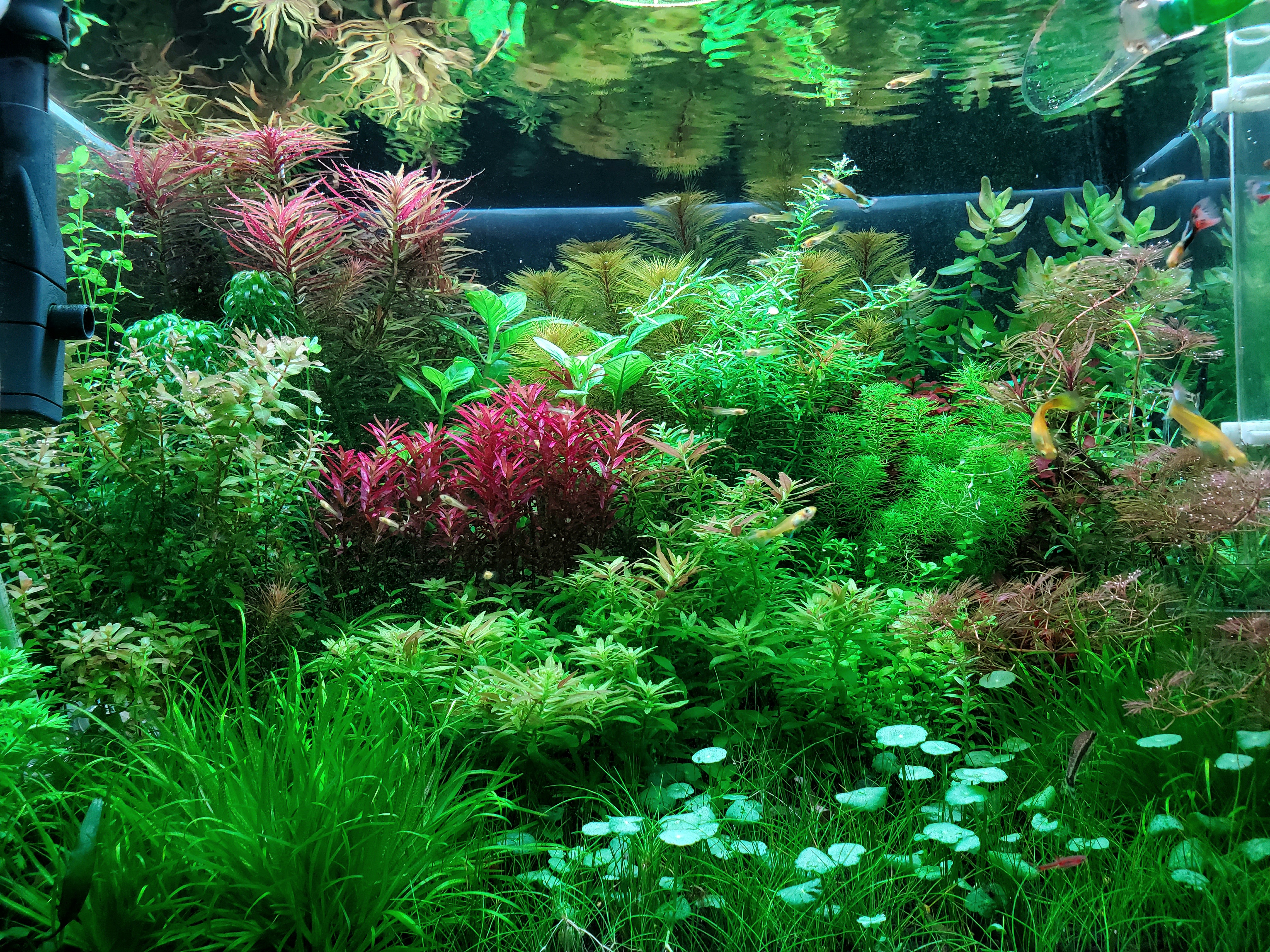 Élőlények :fancy guppy,otocinclus affinis, red cherry, crystal red garnélák