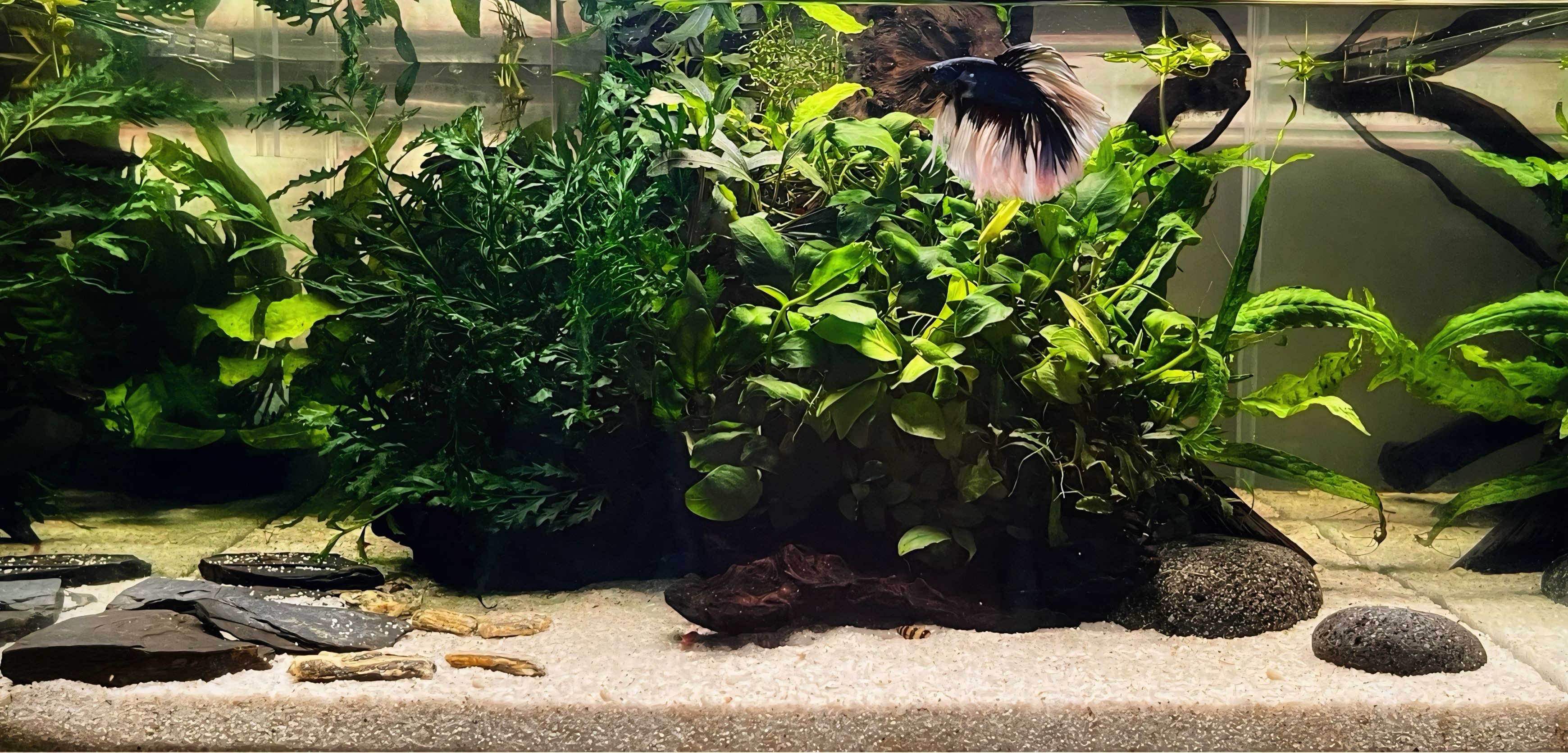Fő tulajdonosa Amir a gyáva betta, akinek öt cory, egy sisak csiga, négy helena és valahol 35db red cherry garnéla a személyzete, akik most nem akartak szerepelni a képen