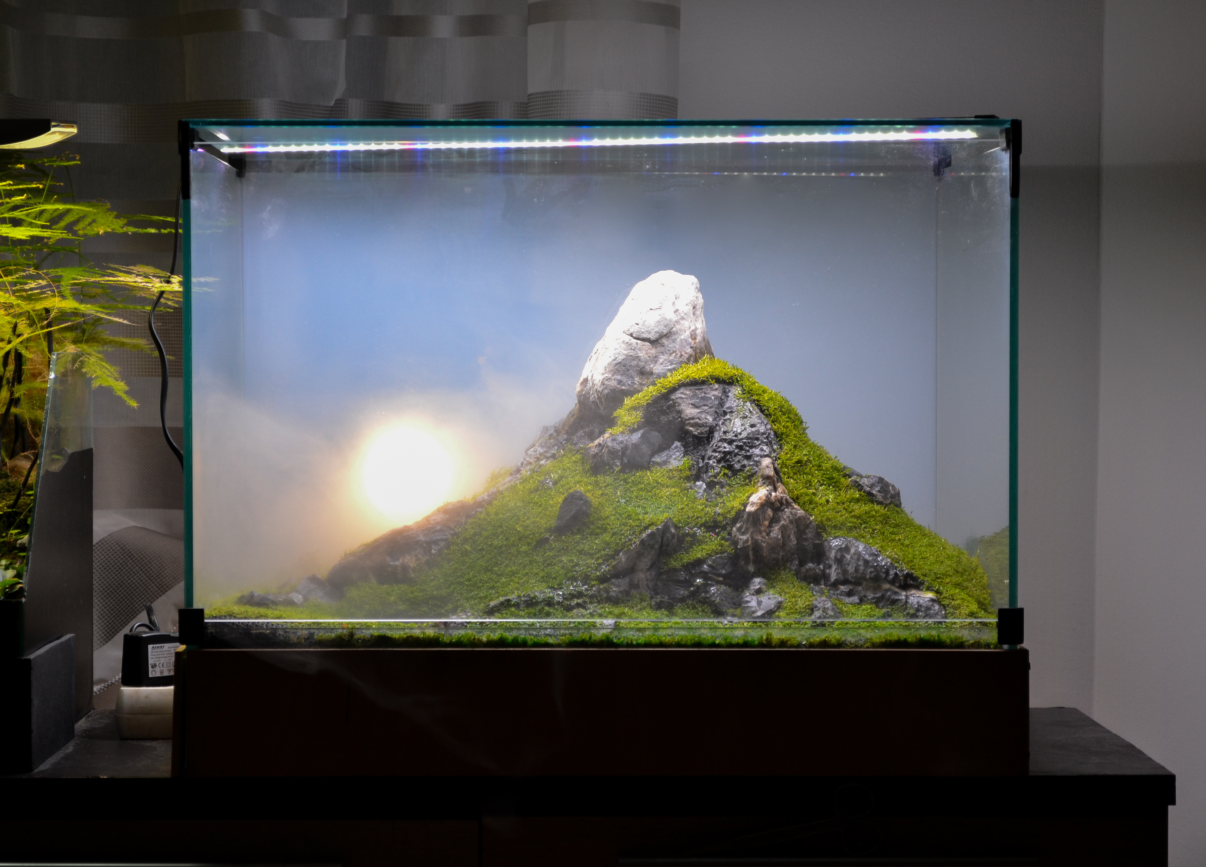 Technika: Vízmennyiség ~24L, Eheim CompactOn 600 vízpumpa, Eheim LED lámpa, ultrahangos párásító, nap: Olcsó Ikeás led lámpa.